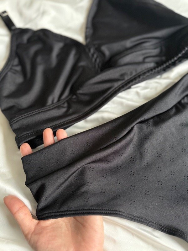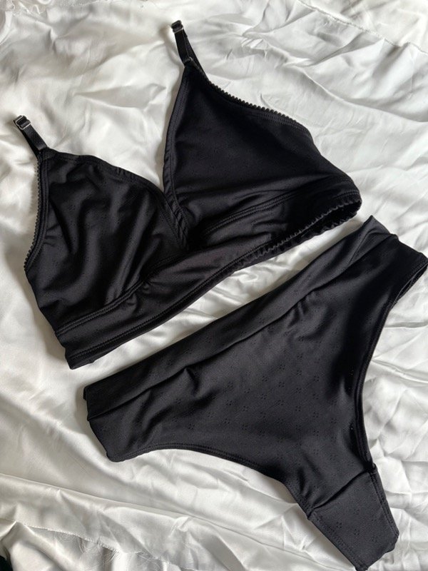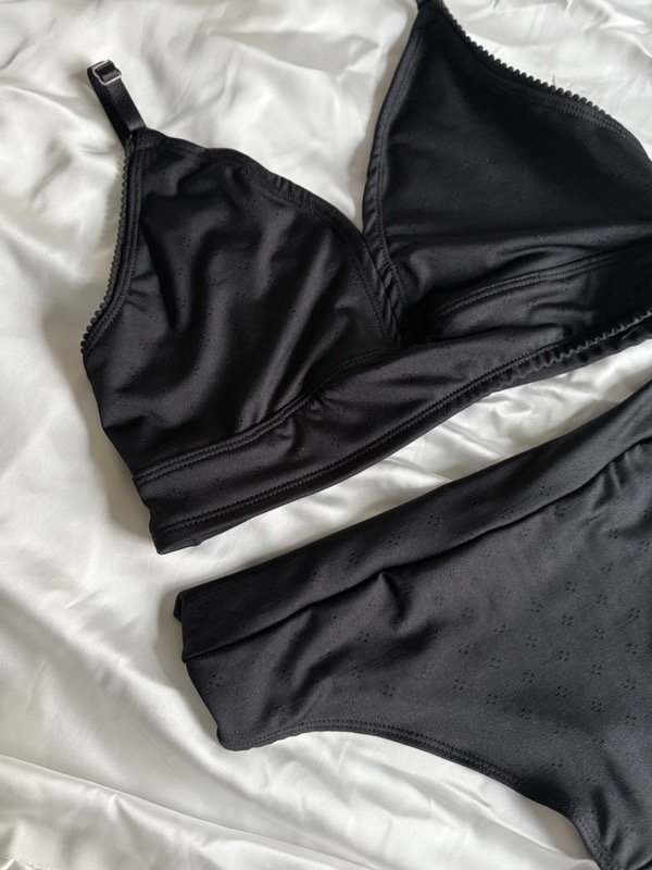 El corpiño incluye bolsillo para taza (no incluida) y se complementa con una bombacha a elección: colaless o vedetina, según tu estilo.